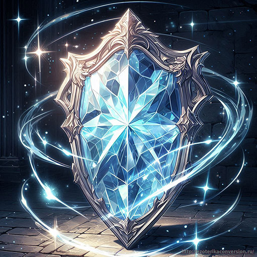 Энергия Кристалла, входящего в центр Защитного Щита наполняет тело и разум прочностью и чистотой, сверкающим белым светом высочайших вибраций, ослепляя недоброжелателей и защищая от негативных воздействий.